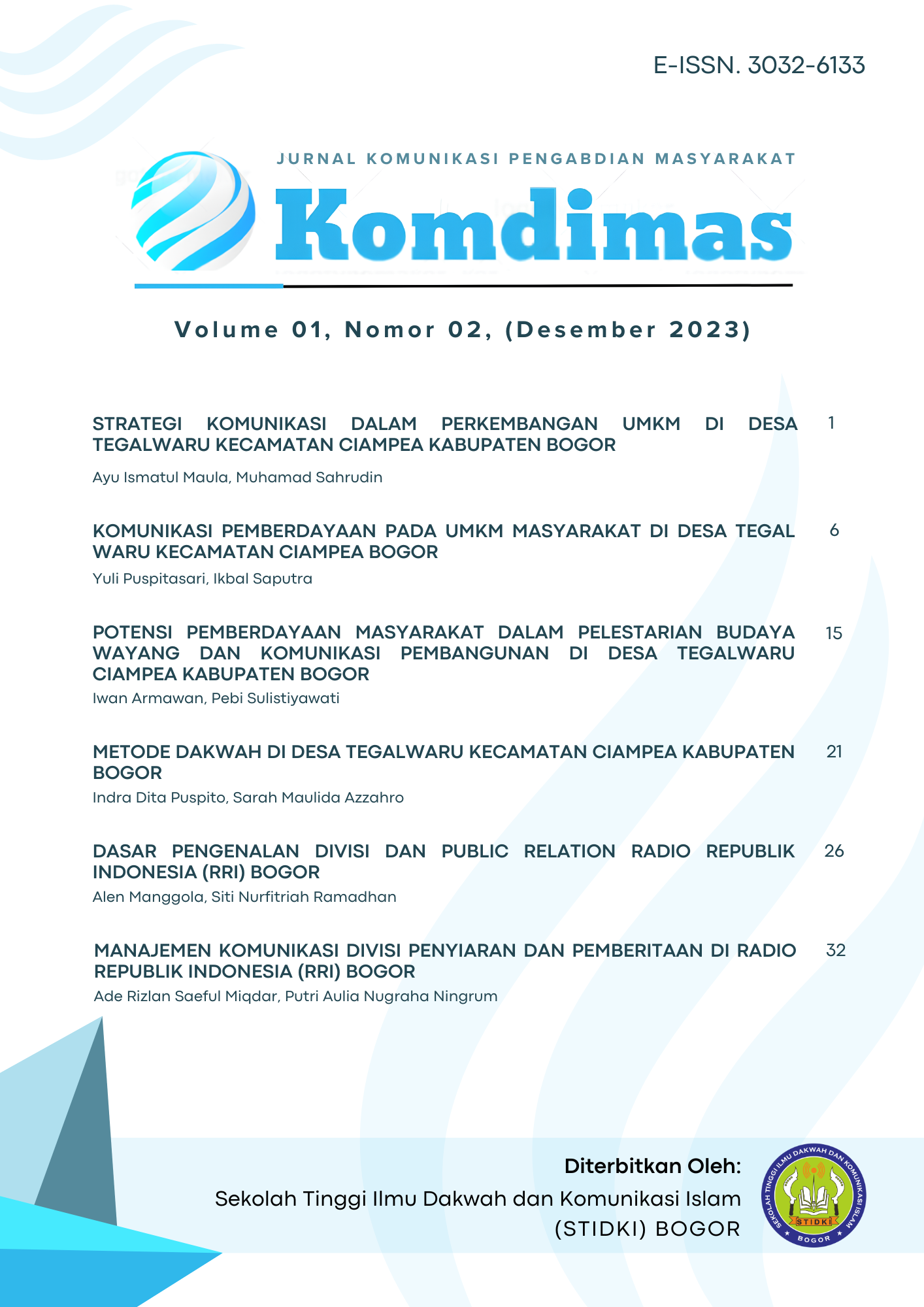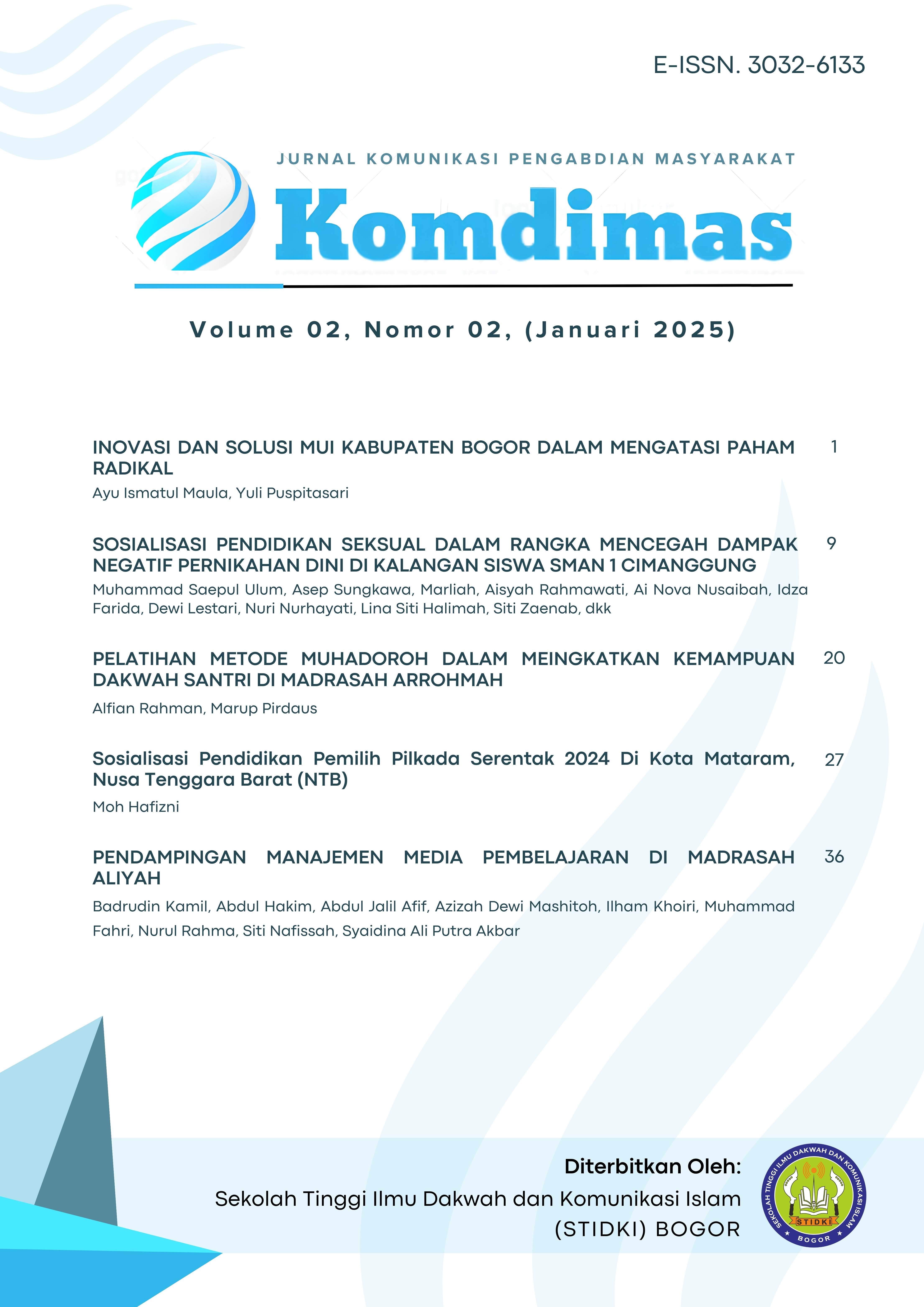 Vol 2 No 1 (2024)Jurnal komdimas adalah jurnal penelitian pengabdian masyarakat pada perguruan tinggi, sekolah tinggi ilmu dakwah dan komunikasi islam (STIDKI) Bogor. Jurnal ini berisi hasil penelitian berupa kegiatan pengabdian dan pemberdayaan masyarakat yang berfokus pada bidang ilmu dakwah dan komunikasi. Jurnal pengabdian kepada masyarakat tidak hanya mempublish kegiatan pelayanan profesional, yakni kegiatan-kegiatan penerapan ilmu pengetahuan dan teknologi dalam rangka membantu perkembangan dan kemajuan masyarakat dalam berbagai aspek kehidupan. Berdasarkan kompetensi keilmuan yang dimiliki akademisi.